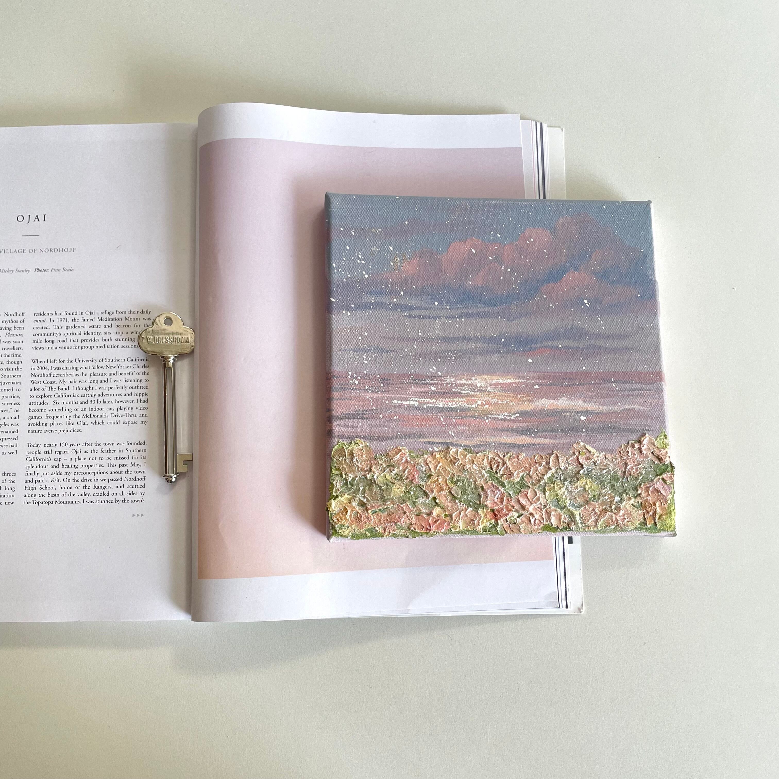 暖かい季節に咲くふんわりとした花と、柔らかい雲と海を描きました。